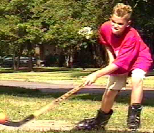 Nick w/ his old hockey stick and skates. You should see him with his new equipment.